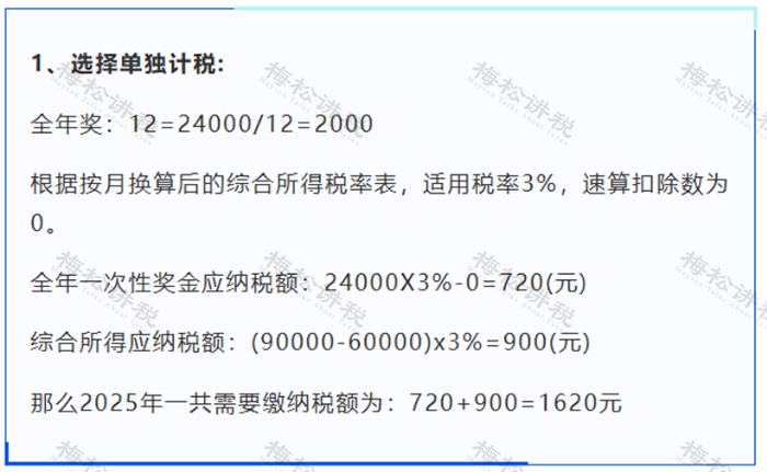小松2025年全年工资90000元年底取得全年一次性奖金24000元,不考虑三险一金、专项附加扣除等,如何计算个人所得税?
