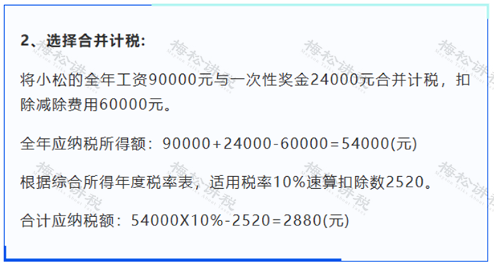 2、居民个人取得全年一次性奖金,也可以选择并入当年综合所得计算纳税。